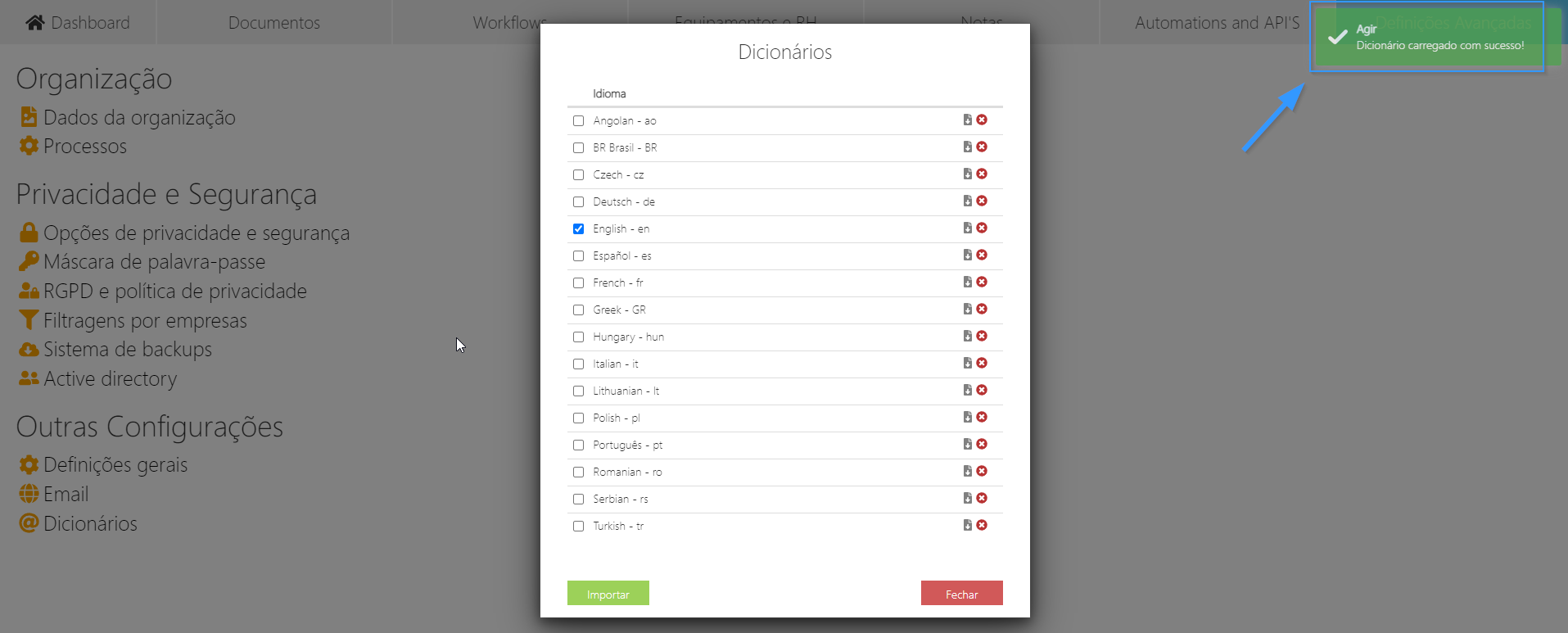 4. Importe o dicionário clicando em Importar e fazendo double click no ficheiro que transferiu no primeiro passo.