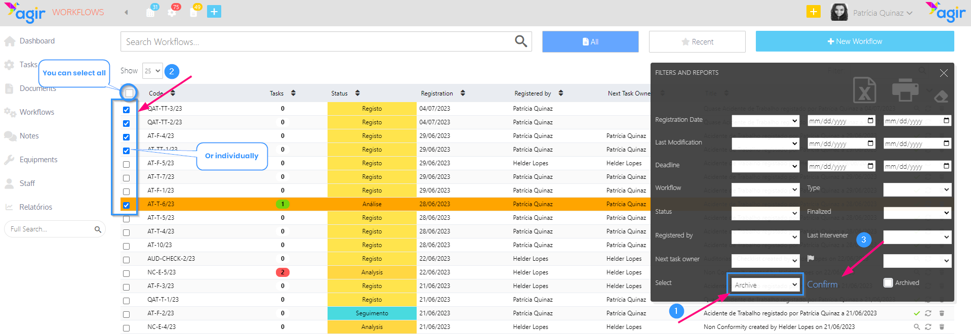 In AGIR it's possible to archive, restore and delete multiple records at a time. This possibility is used usually in Workflow and Documents Modules, but you can also use it in Equipments Module to delete multiple equipment at once.