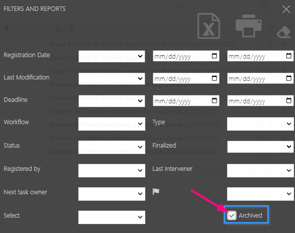 1. To unarchive records or documents, you will first have to access the list of archived records/documents. To do so, click on the filter icon and check Archived.