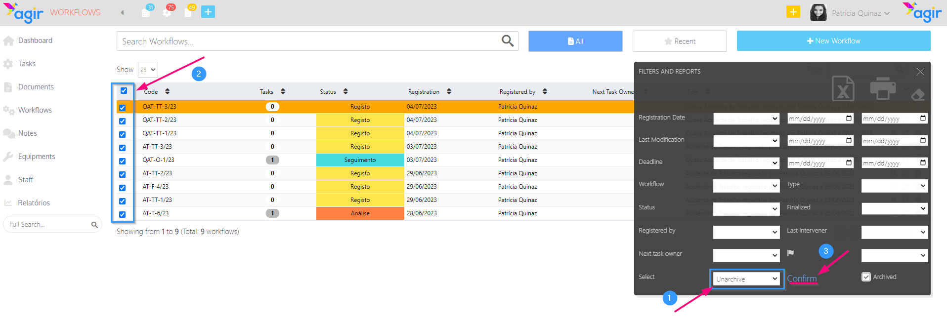 TIP In step 2, you can apply filters so that only records/documents with the properties you want appear. You may, for example, want to file records in the Registration status with an regristration date between 2022/01/01 to 2023/31/12. Thus, it becomes easier to identify the records/documents that you want to unarchive.