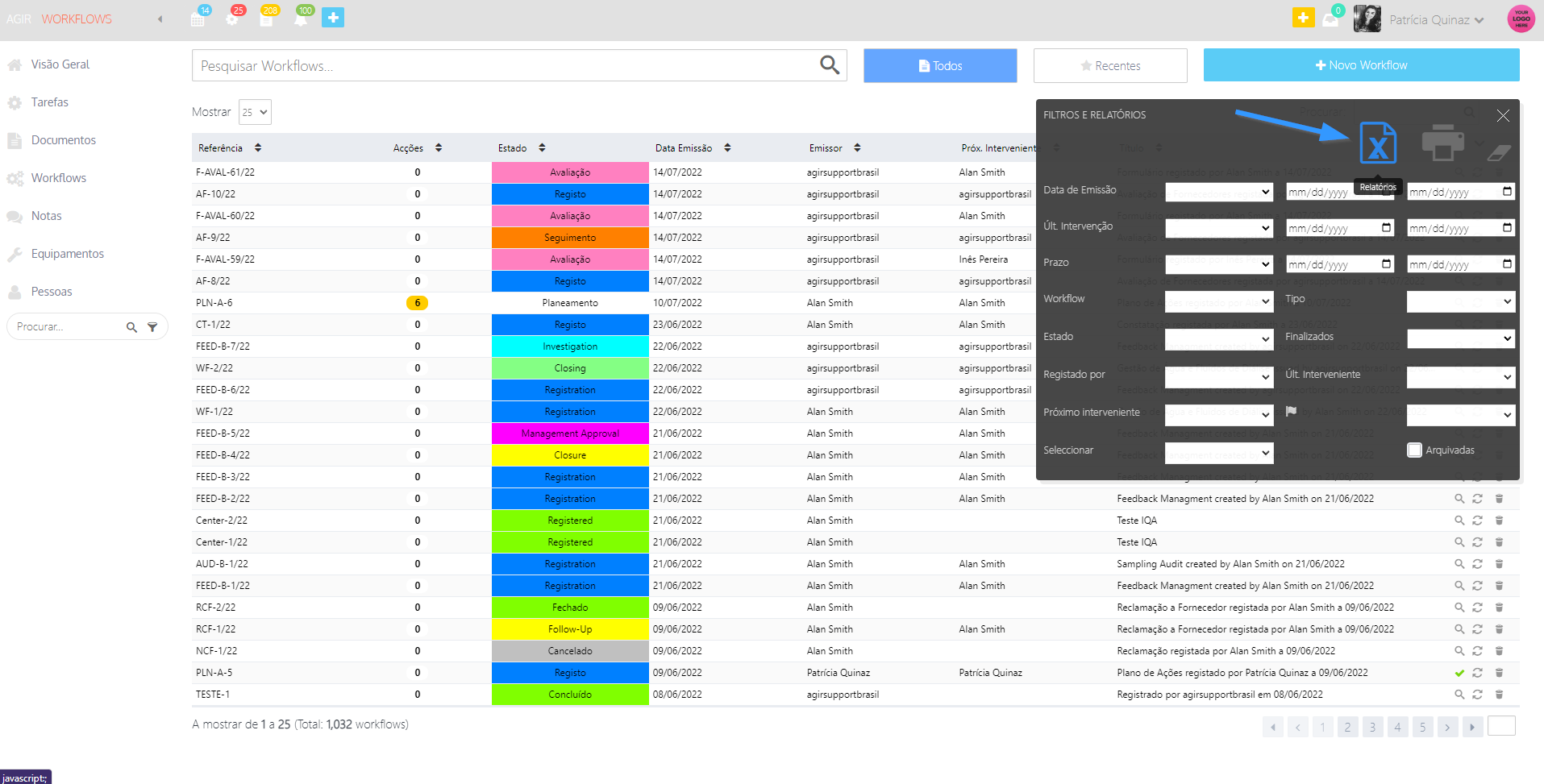 Abaixo, explicamos os passos para exportar a lista de workflows filtrados para um ficheiro Excel (formato .xlsx), juntamente com dicas importantes para garantir que obtém o máximo desta funcionalidade.