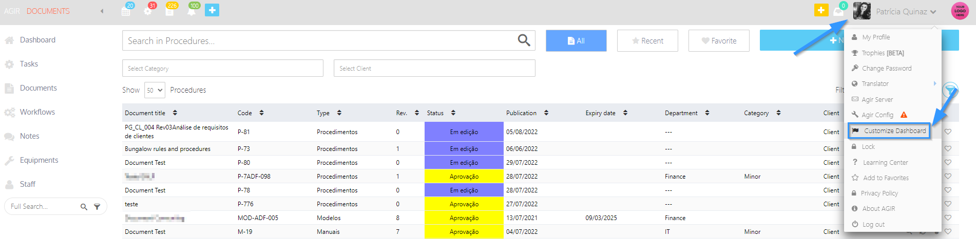 3. Click on your user name, and select the option Customize Dashboard.