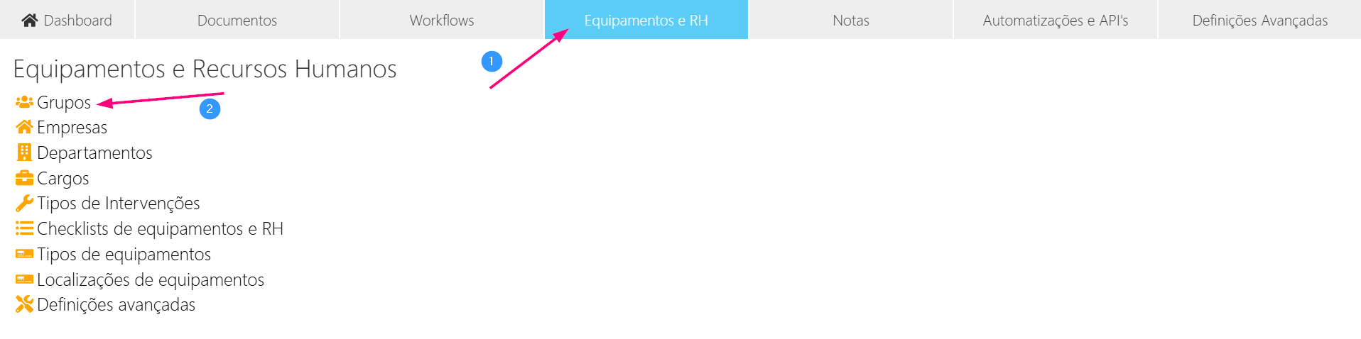 2. Selecione o separador Equipamentos e RH e de seguida, Grupos.