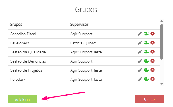 3. Neste menu pode criar novos grupos, editar o nome do grupo e definir os utilizadores que pertencem ao grupo. Para criar um novo grupo, clique em Adicionar.