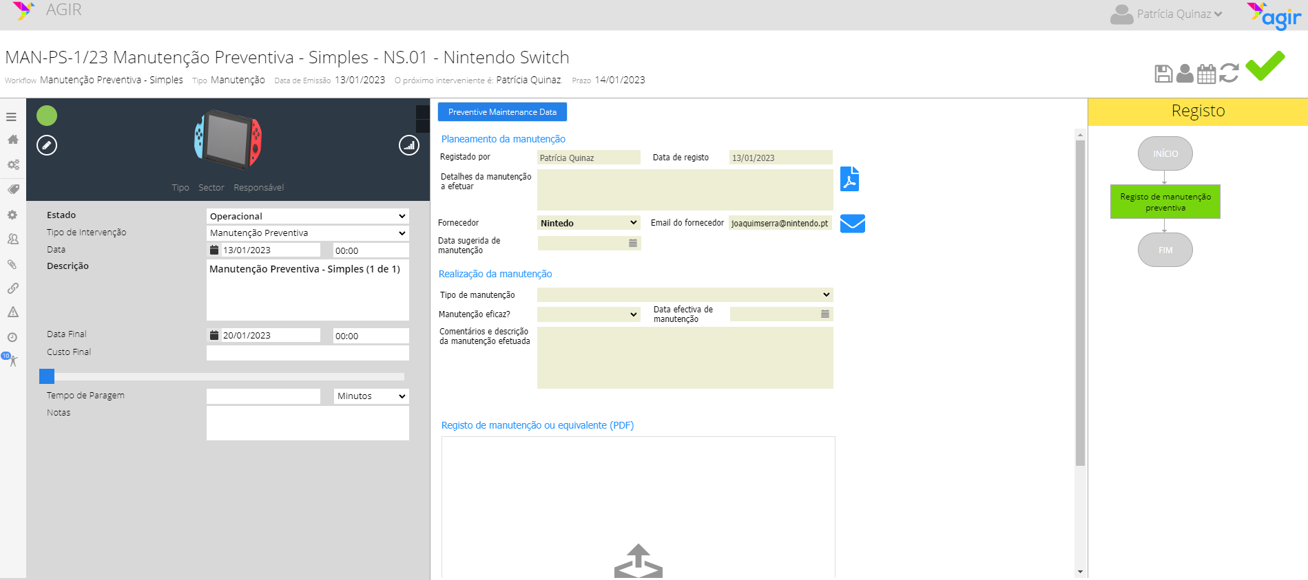 Quando chegar o tempo de fazermos a manutenção preventiva planeada ao nosso equipamento, um alerta será dado por e-mail para os responsáveis pelas manutenções preventivas, ou uma nova tarefa aparecerá nas notificações do AGIR.
