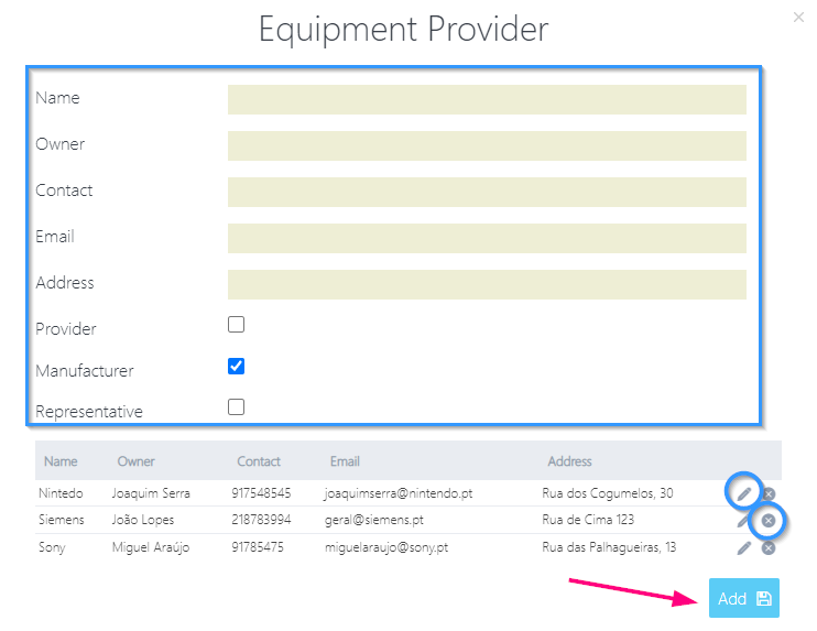 2. On this page, you can edit/delete equipment manufacturers/providers by clicking on the pencil/cross or create new ones by filling out the form and clicking Add down below.