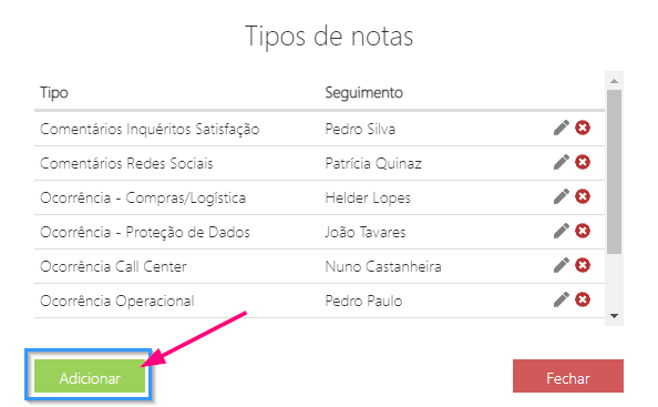 3. Podemos ter acesso aos tipos já criados e os utilizadores selecionados para o seu seguimento. Para adicionar uma nota nova, basta clicar em Adicionar.