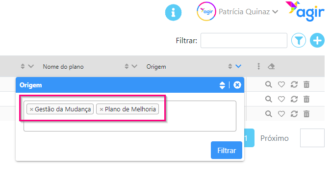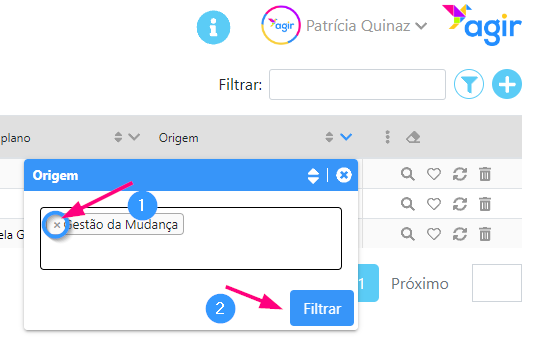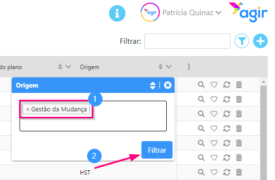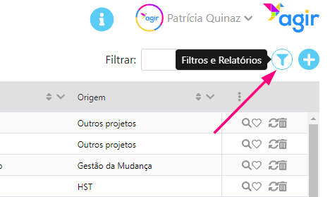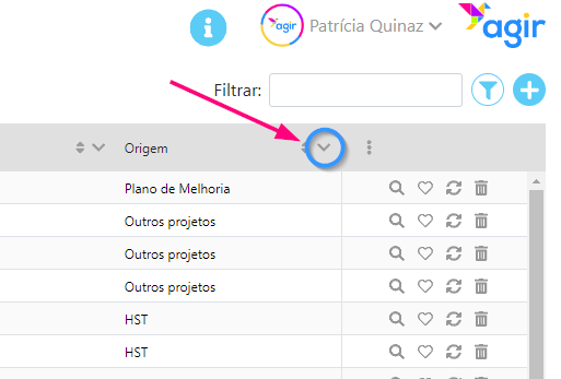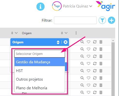 4. Apenas aparecerão os registos cujo valor no campo Origem é Gestão da Mudança. A seta ficou agora azul, indicando que aquela coluna está com filtros aplicados.