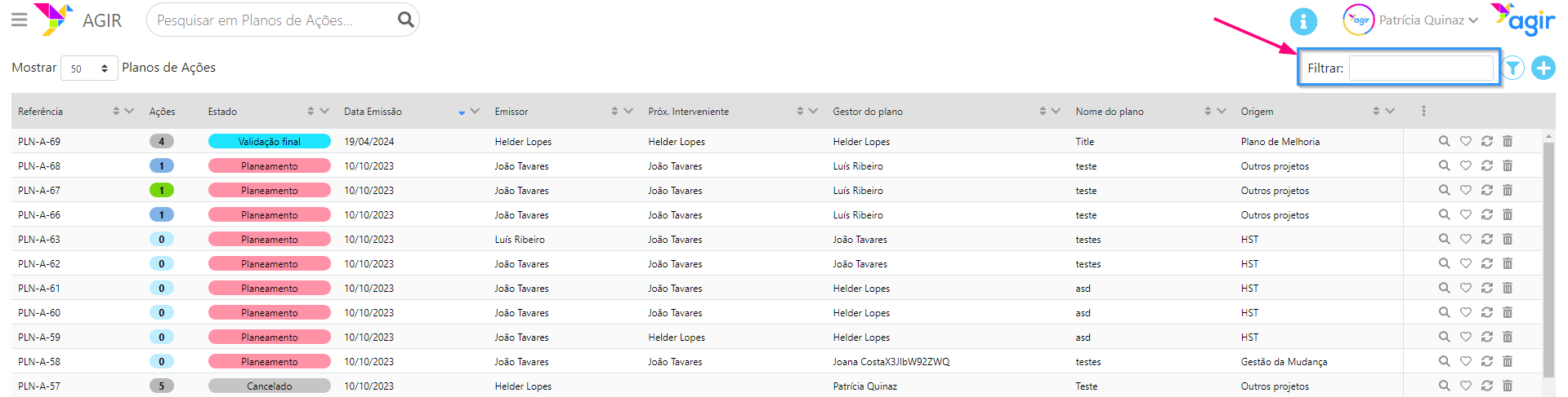 No campo de Filtrar, é possível pesquisar informação existente apenas na datagrid/listagem. É uma forma mais "afunilada" de pesquisar/filtrar informação dos registos do workflow.