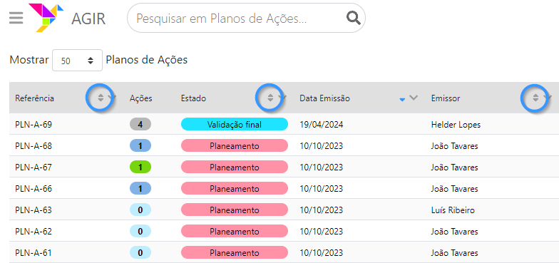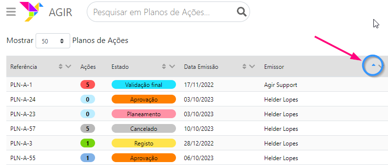 Podemos ordenar a lista clicando nas duas setas presentes em cada coluna, tendo a possibilidade de ordenar de forma ascendente ou descendente.