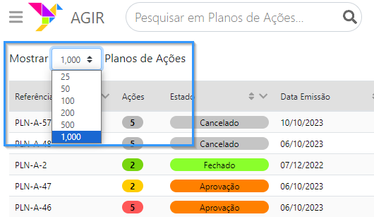 Podemos escolher quantos registos pretendemos mostrar por página, até ao máximo de 1000 registos.