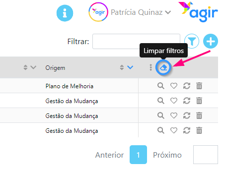 Para voltar à visão inicial, sem filtros aplicados, clique na borracha no canto superior direito para limpar todos os filtros.