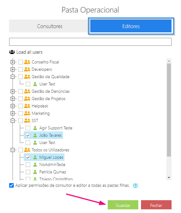 Caso a pasta tenha descendentes, pode aplicar permissões a todas as pastas, bastando para isso selecionar a opção Aplicar permissões de consultor e editor a todas as pastas filhas.