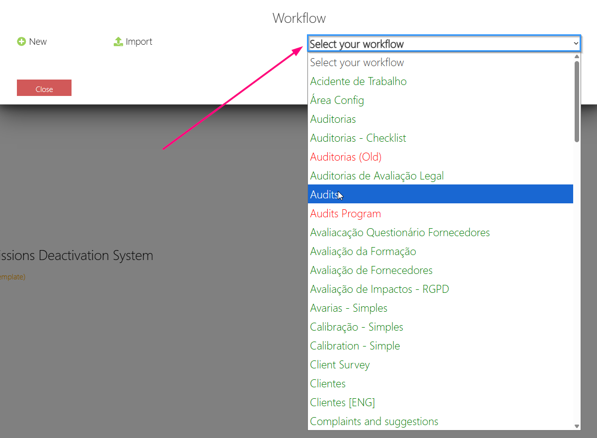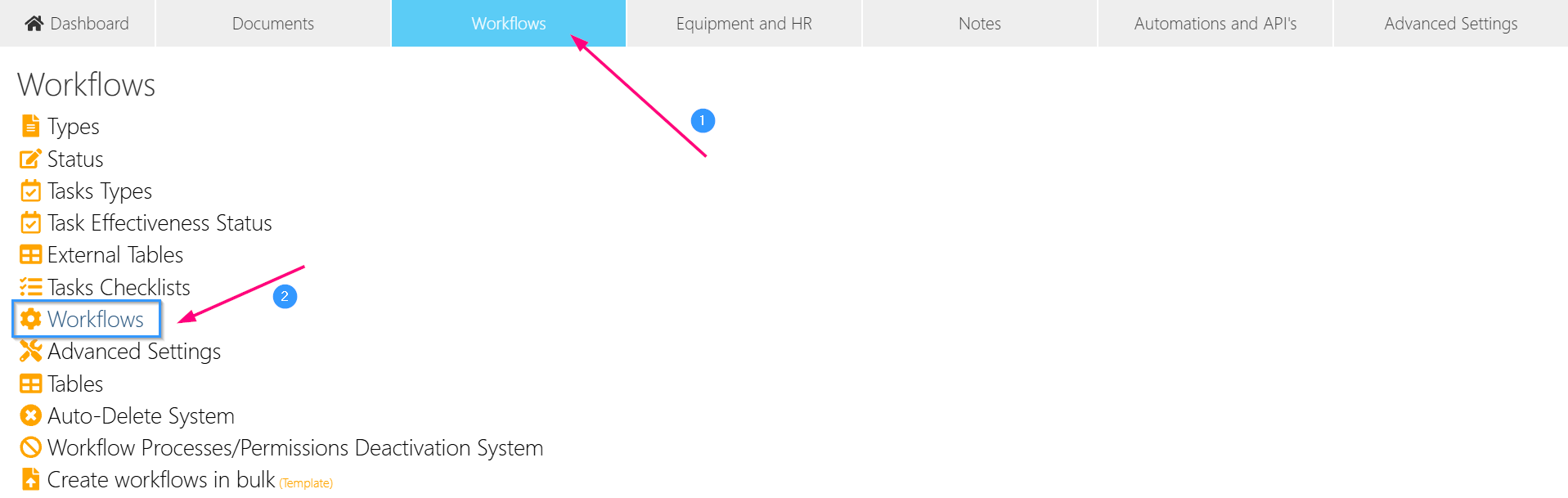 2. Select the Workflows tab, choose the option Workflows from the list.