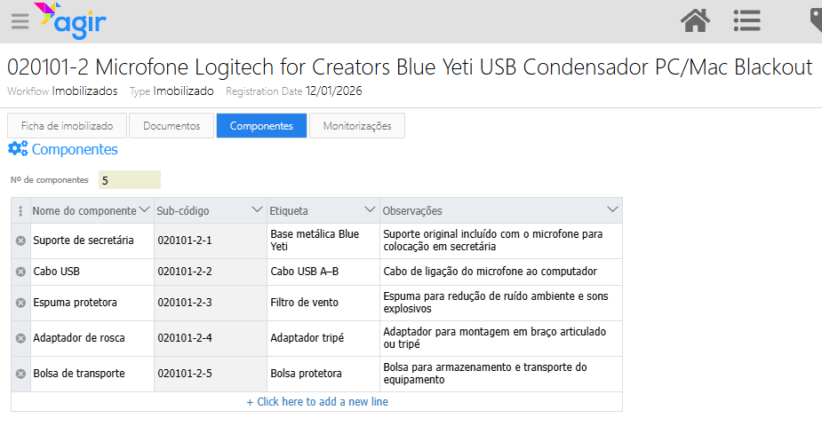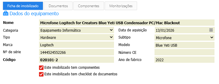 Se o imobilizado for composto por vários elementos internos, estes são registados em componentes.