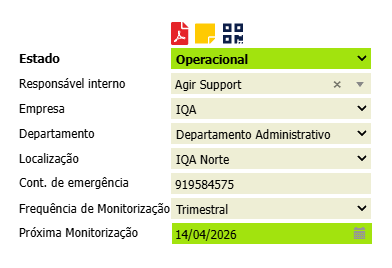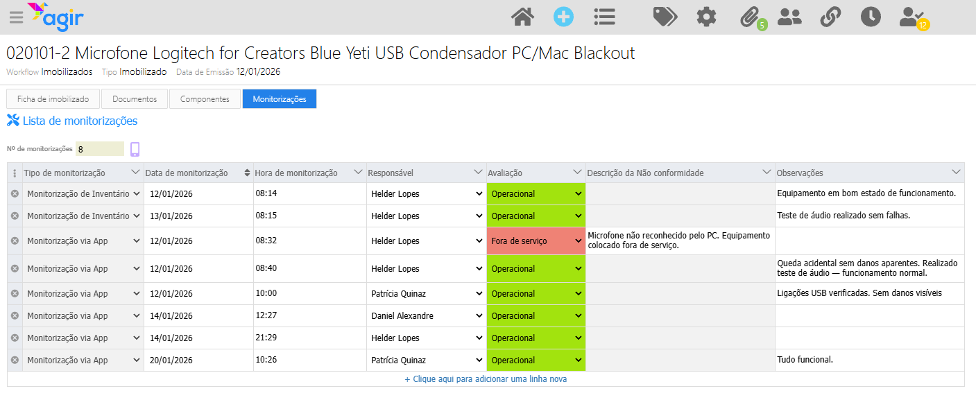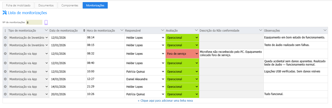 Nota importante: A última monitorização registada é a que determina o estado atual do equipamento. Se numa monitorização o técnico indicar que o equipamento está fora de serviço, o estado do imobilizado muda automaticamente para fora de serviço.