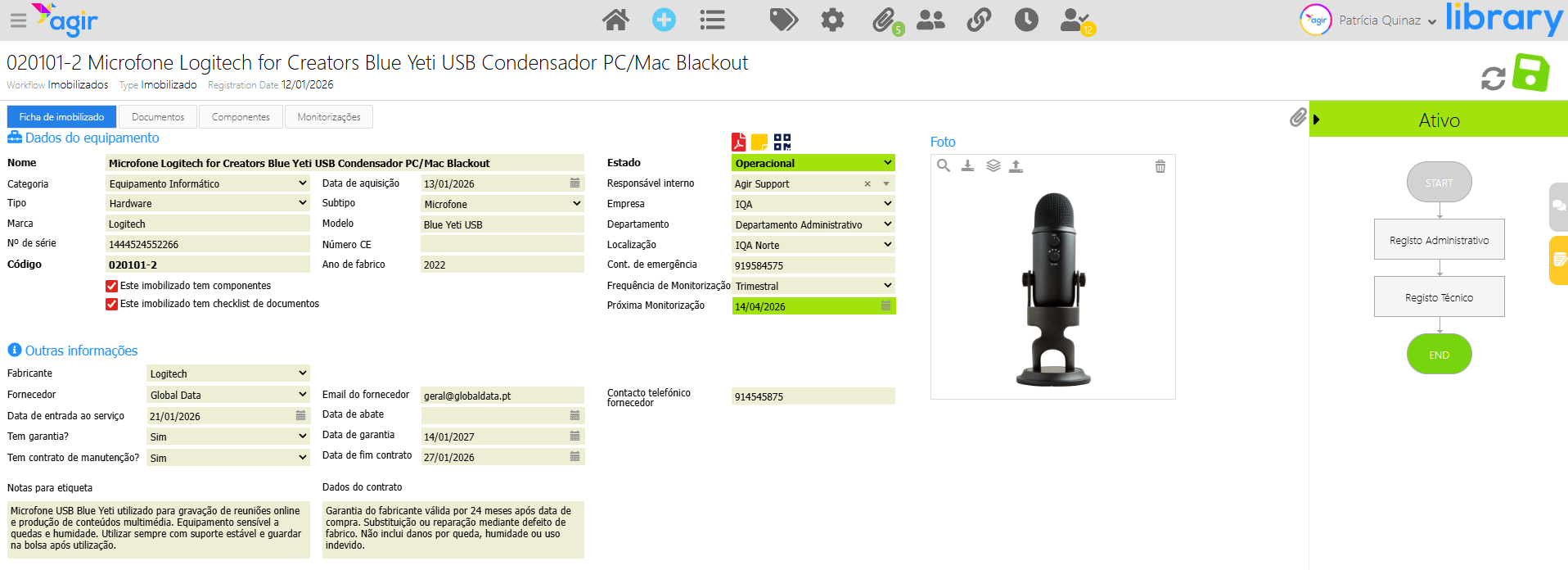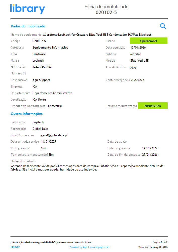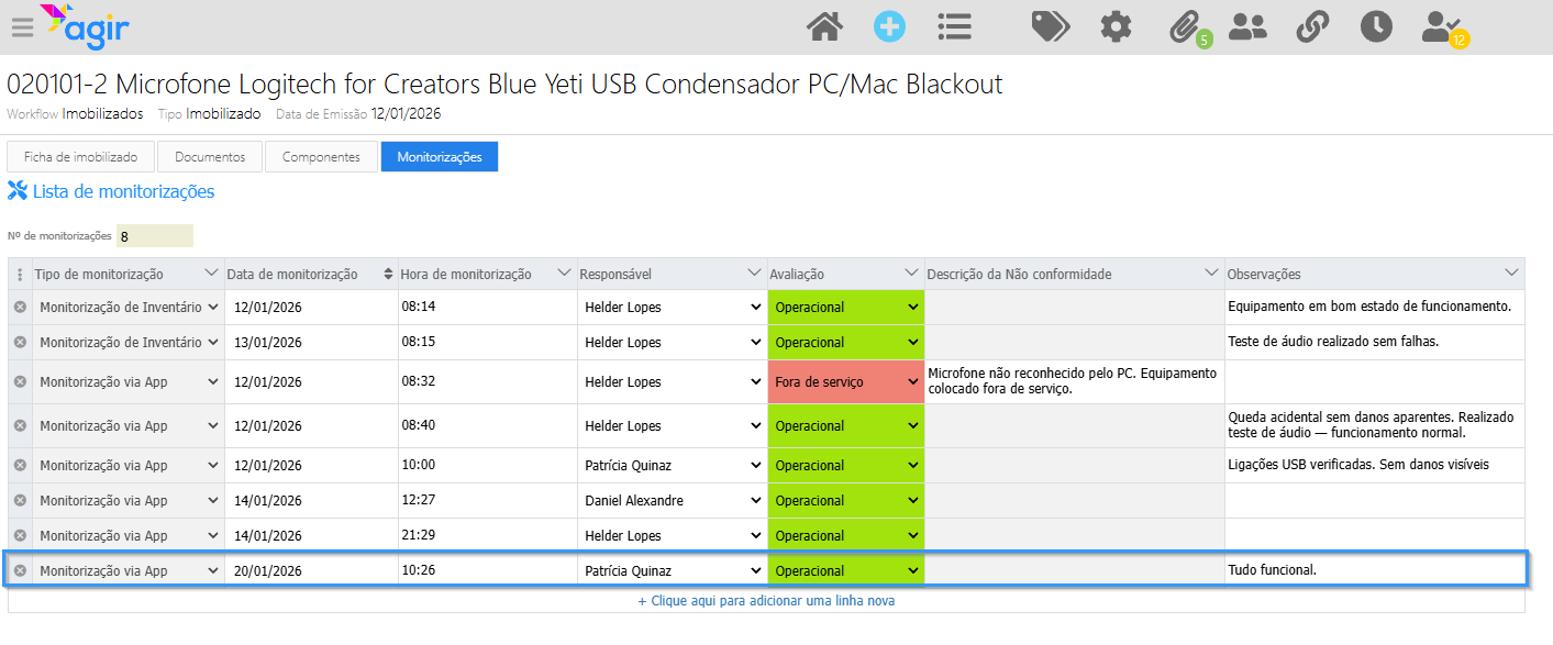 A última monitorização registada ao equipamento é a que define o estado atual do imobilizado.