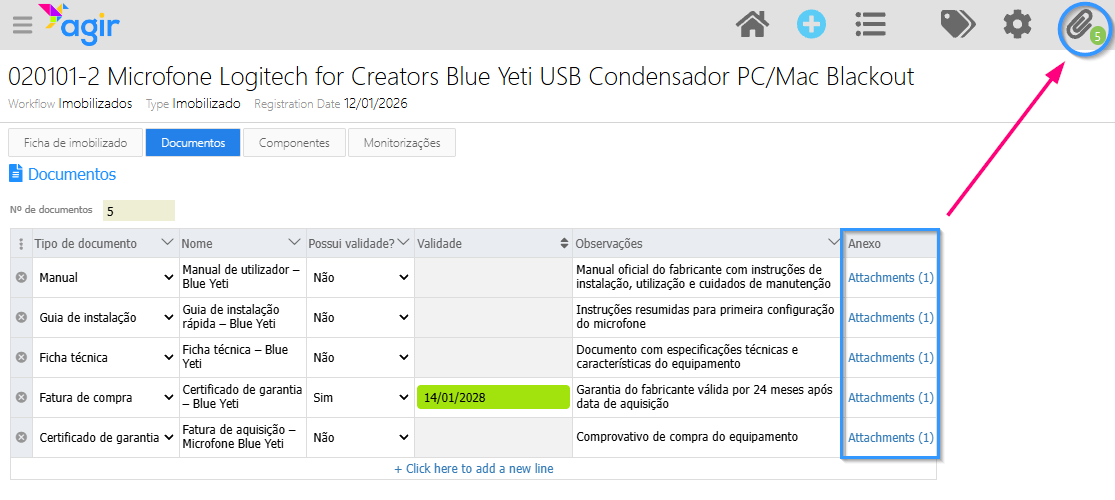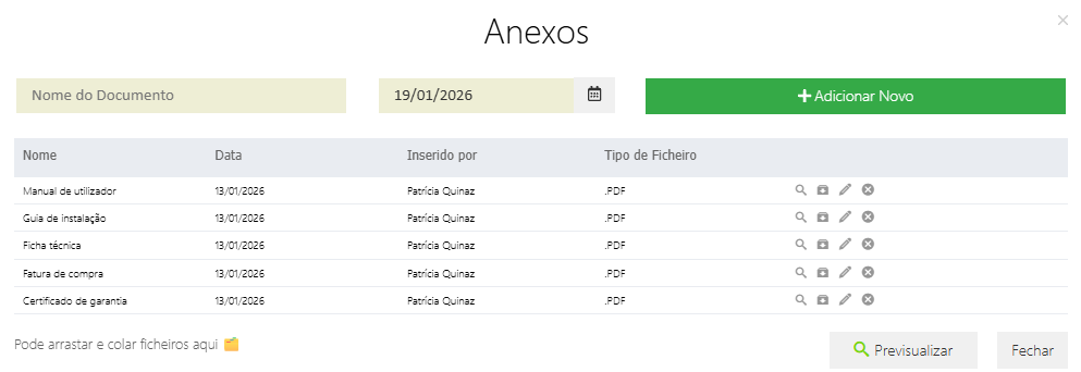 Todos os documentos anexados à linha correspondente de cada documento, ficam disponíveis no menu Anexos.
