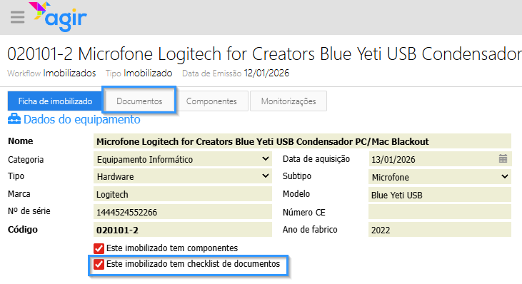 O separador Documentos fica visível caso selecione que o imobilizado em questão tem checklist de documentos.