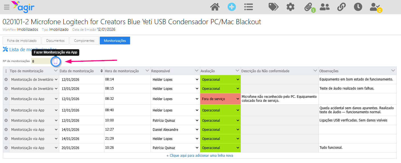 A monitorização via app ficará registada automaticamente no separador Monitorizações do Imobilizado.