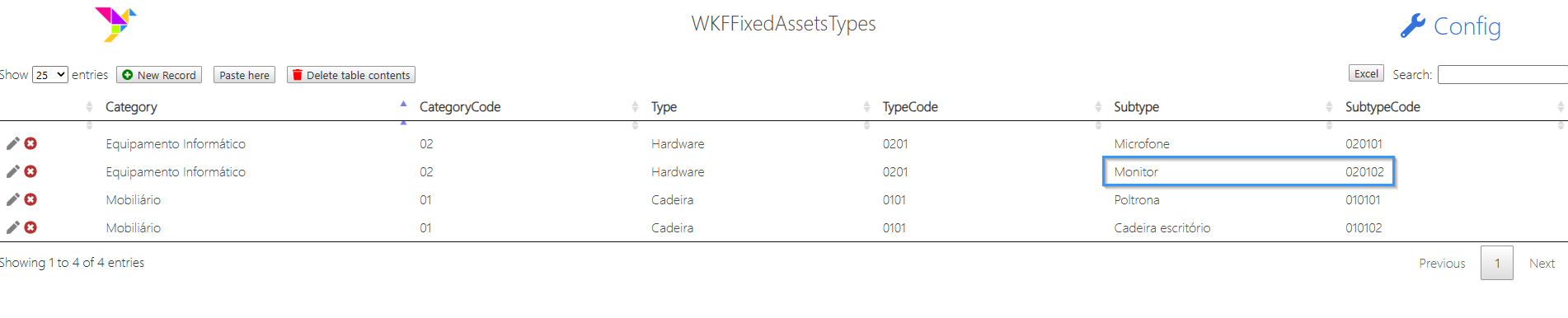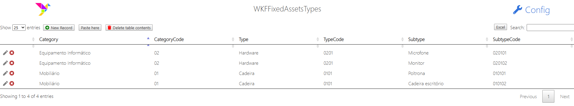 - A tabela externa "WKFFixedAssetsConfigTypes", tem como propósito a configuração de categorias dos imobilizados e o código correspondente, tipo de imobilizado e código, subtipos de imobilizado e subcódigos.