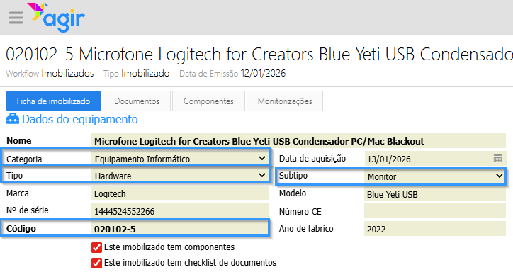 Código interno do imobilizado: Automático de acordo com referência parametrizada para o tipo de equipamento e número sequencial. Esta referência pode ser parametrizada na tabela externa "WKFFixedAssetsTypes". Apenas Administradores do AGIR ou do Workflow podem gerir tabelas externas. Para saber como, consulte o artigo Tabelas externas - como criar e gerir dados