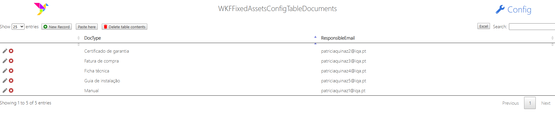 - A tabela externa tem o nome de "WKFFixedAssetsConfigTableDocuments" e serve para configurar os tipos de documentos selecionáveis no separador Documentos, e o e-mail do utilizador que vai receber o alerta de caducidade desse tipo de documento.