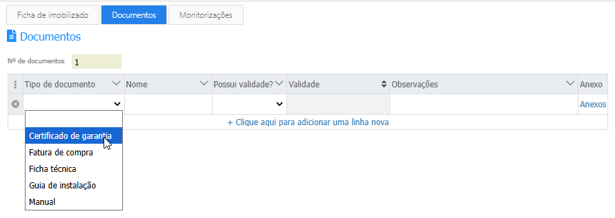 Ao listar os tipos de documentos, os mesmos aparecerão para seleção na tabela da documentação do imobilizado: