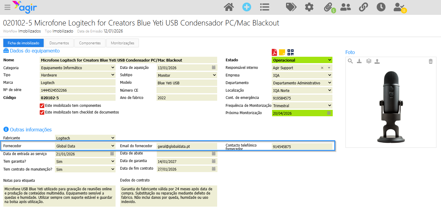 - Fabricante e fornecedor: A lista de fornecedores é proveniente do workflow "Fornecedor". O E-mail do Fornecedor e Contacto telefónico são preenchidos automaticamente ao escolher o fornecedor, caso estes dados estejam preenchidos no registo do mesmo.