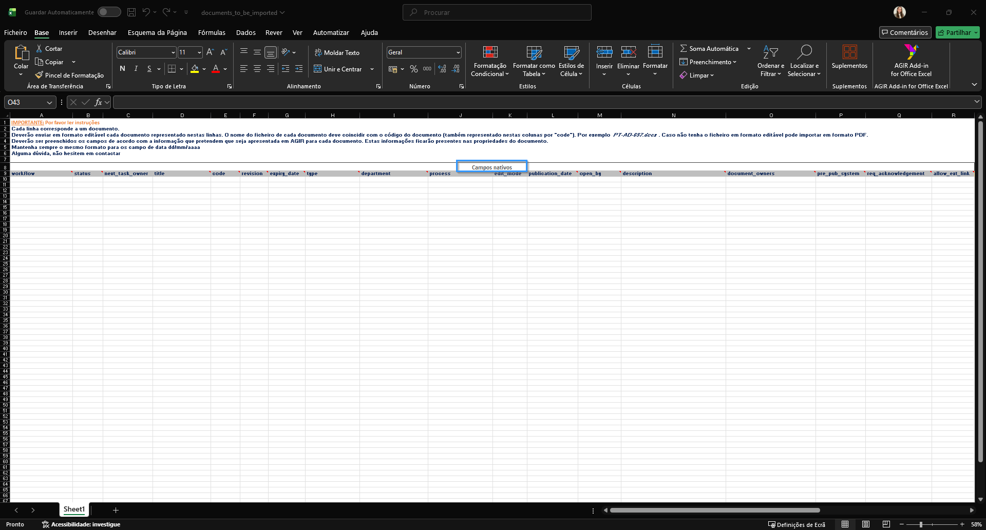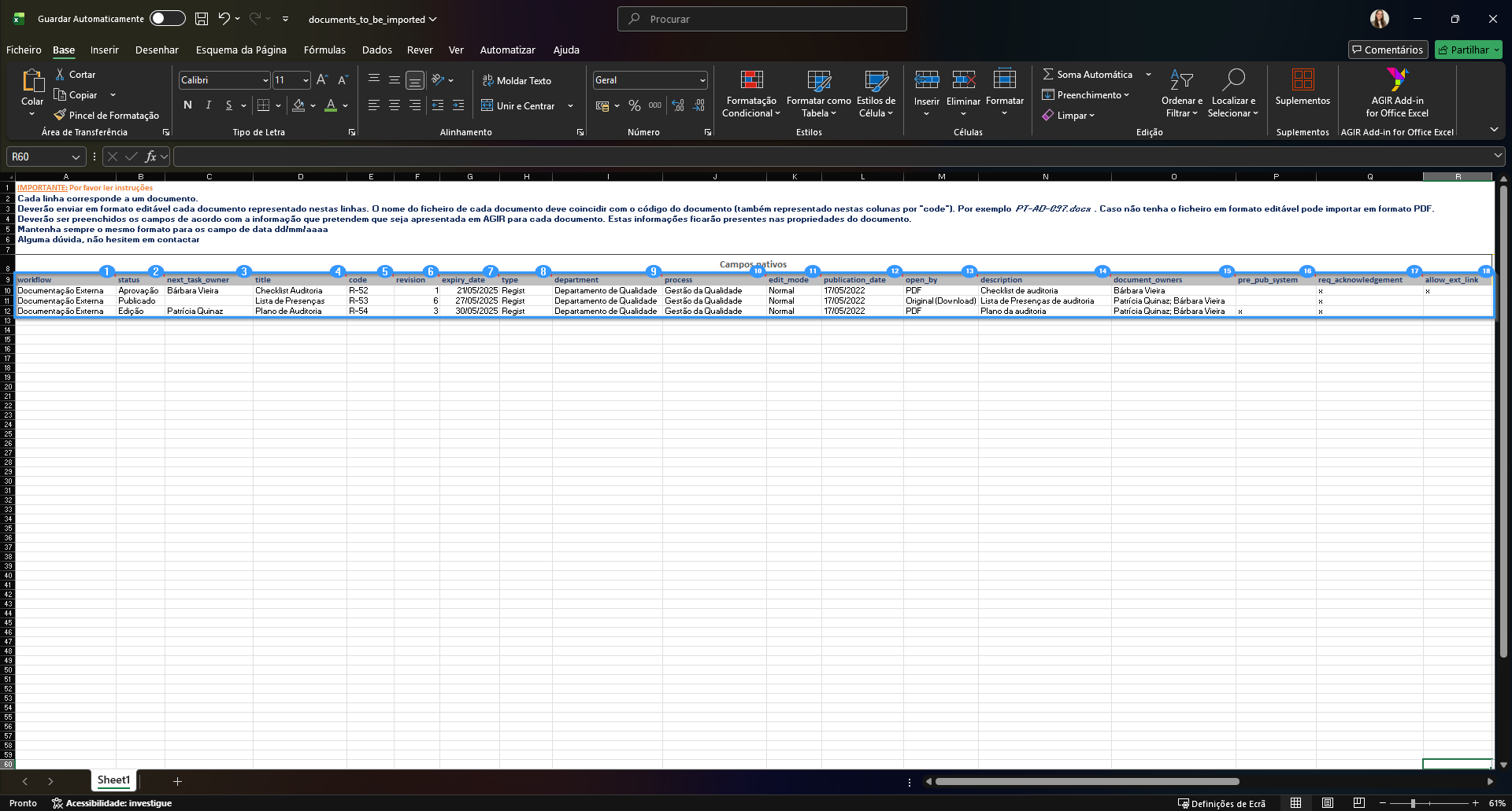 Este ficheiro é preparado com base no seu AGIR, incluindo listas de opções já alinhadas com os valores existentes, por exemplo Tipo, Departamento, Processo, Estado e outros campos aplicáveis. Desta forma, garantimos que a informação preenchida fica coerente com a parametrização do seu sistema e evitamos erros na importação.