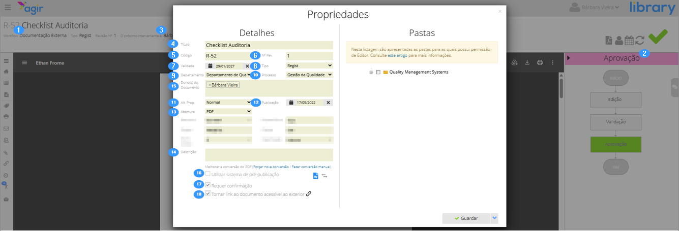 15. Document_owners (Dono(s) do Documento): Indique os donos do documento, quando aplicável. Os nomes devem corresponder exatamente ao nome do utilizador no AGIR e devem ser separados por ponto e vírgula. Se esta funcionalidade não estiver ativa no seu AGIR e pretender utilizá-la, consulte o artigo Dono do documento - vantagens e como o usar.