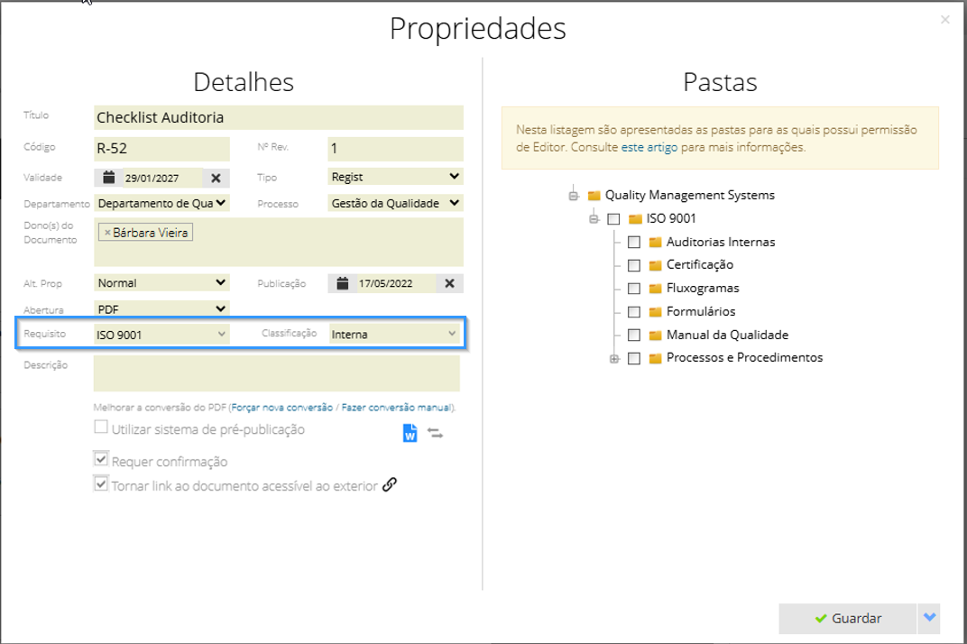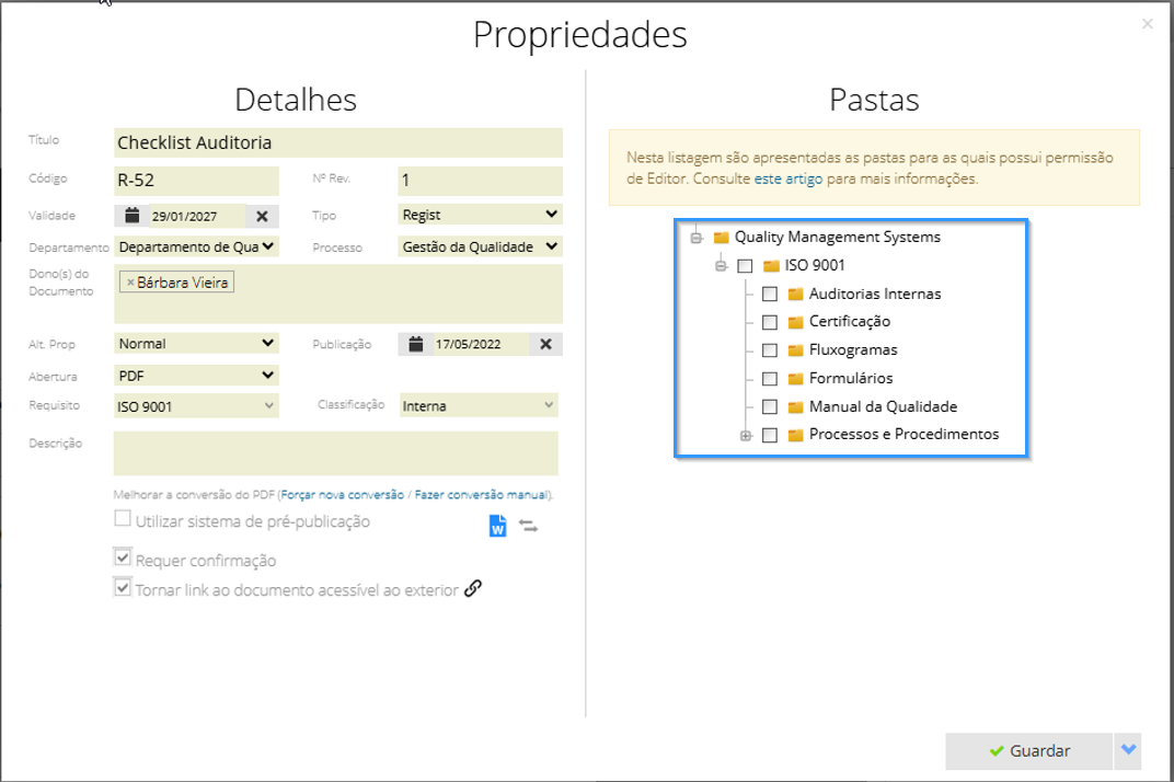 As pastas são úteis para gerir as permissões de consulta dos utilizadores. Tenha isso em conta na altura de criar as pastas de documentos.