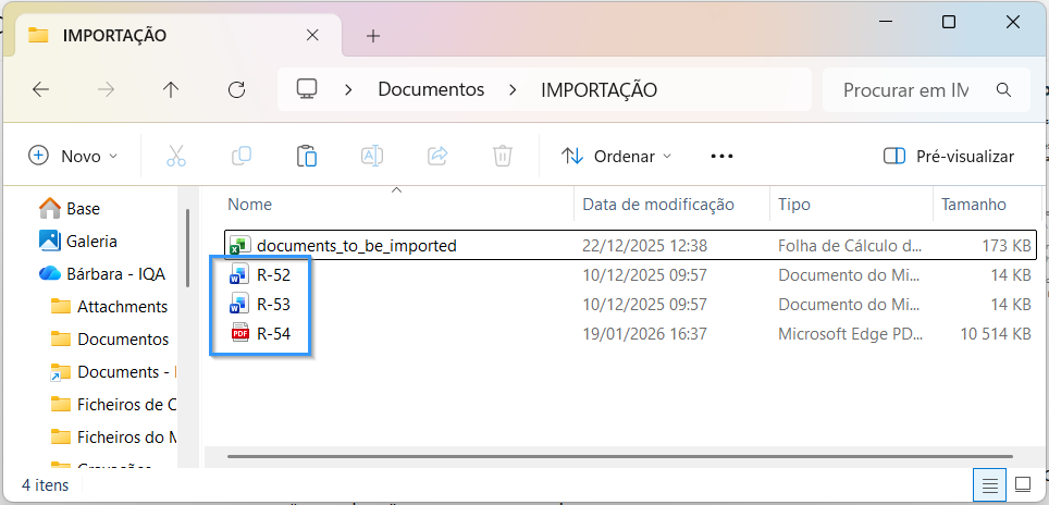 Regra obrigatória: o nome de cada ficheiro tem de ser exatamente igual ao código indicado para esse documento no ficheiro Excel (coluna code). Exemplo: se o valor na coluna code for PDQC-1, o ficheiro deve chamar-se PDQC-1.docx ou PDQC-1.pdf.