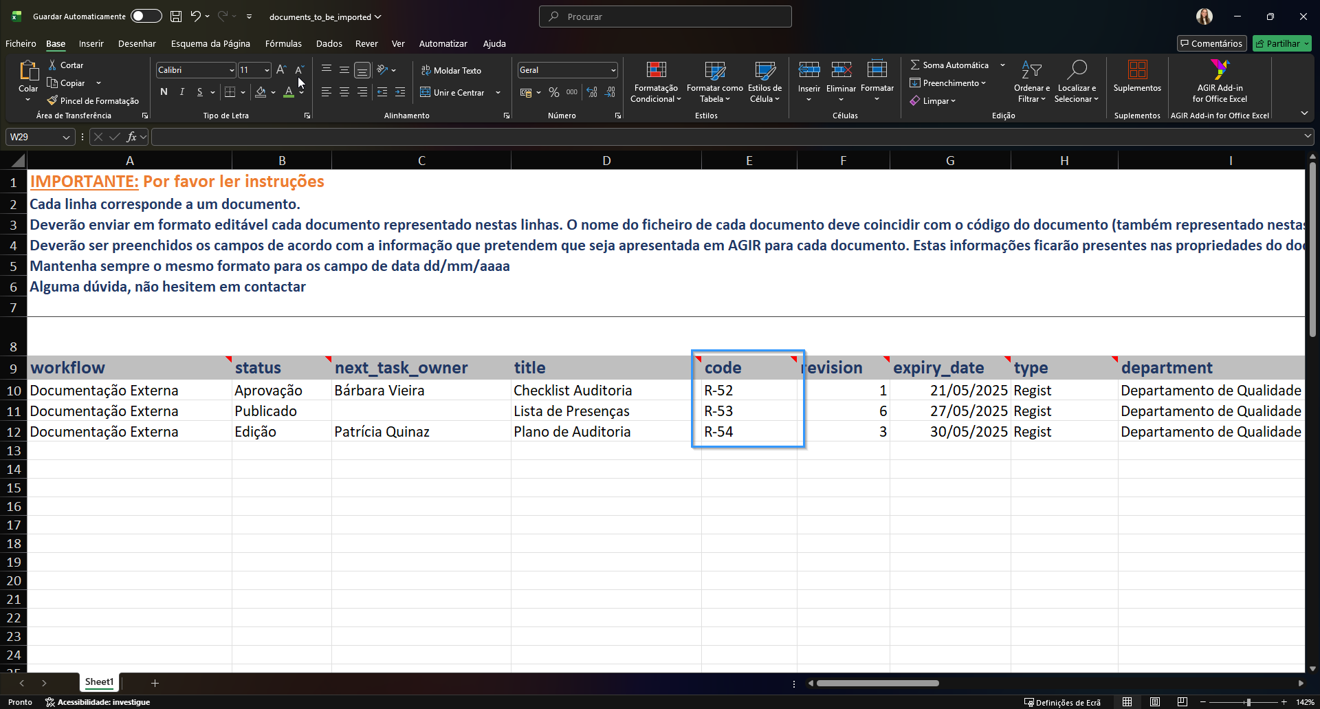 2. Todos os ficheiros dos documentos a importar, de preferência em formato editável (Word, Excel, Powerpoint...), correspondentes a cada linha do Excel. O nome destes ficheiros devem corresponder ao código que os mesmo herdarão no AGIR (preenchido na coluna Code). Se forem muitos documentos, recomendamos o envio numa pasta comprimida.