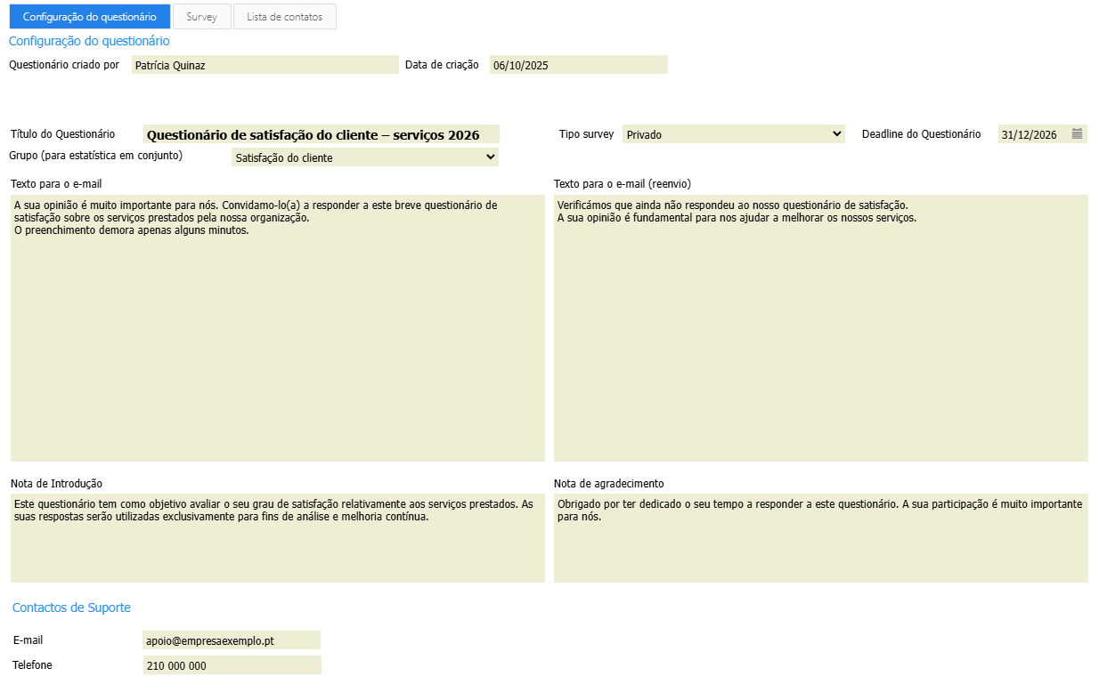 Adicionalmente, o cliente deverá fornecer o modelo do questionário, com a indicação das perguntas, tipos de resposta e respetiva estrutura, para que a nossa equipa possa proceder à sua correta configuração no sistema.