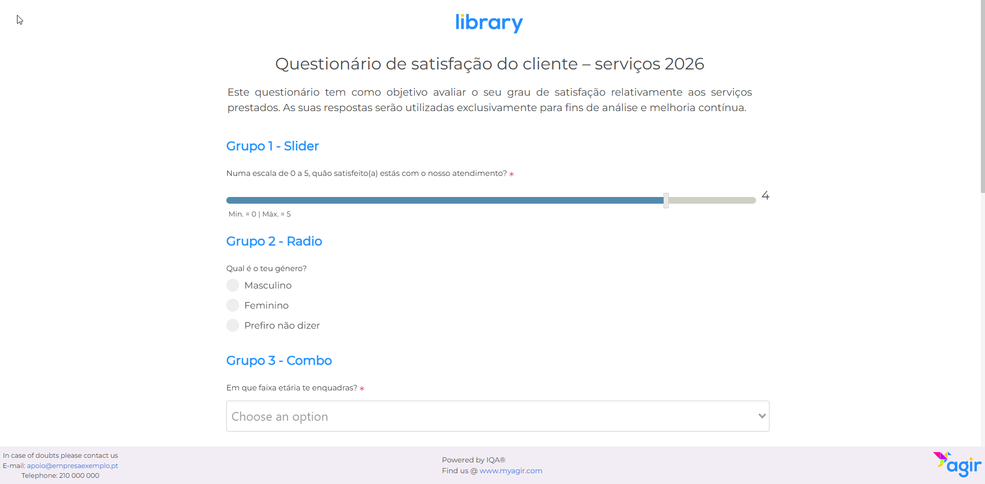 Para que a IQA possa proceder à parametrização do questionário no AGIR, é necessário que nos disponibilize a seguinte informação: