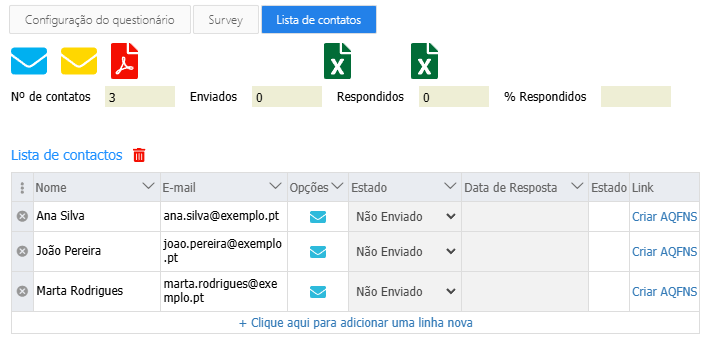 Esta lista de contactos é obrigatória apenas nos questionários do tipo privado, uma vez que o envio é feito diretamente para os destinatários definidos.