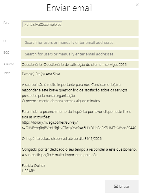 Envio individual, possibilitando o envio do questionário a contactos específicos, de forma pontual.