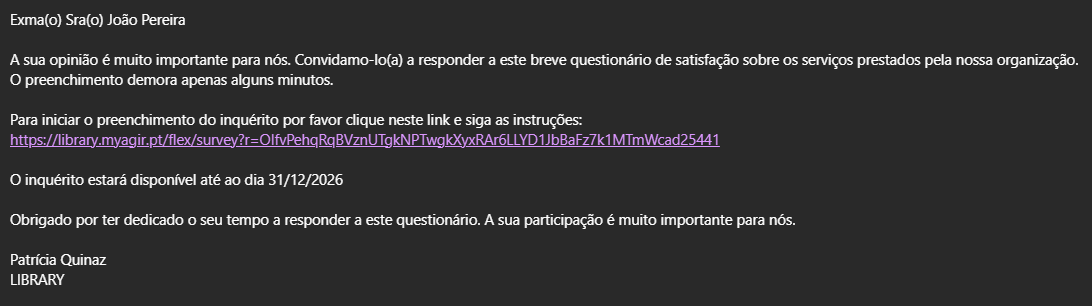 De seguida, apresentam-se exemplos das notificações enviadas aos destinatários, ilustrando a forma como o convite para resposta é recebido.