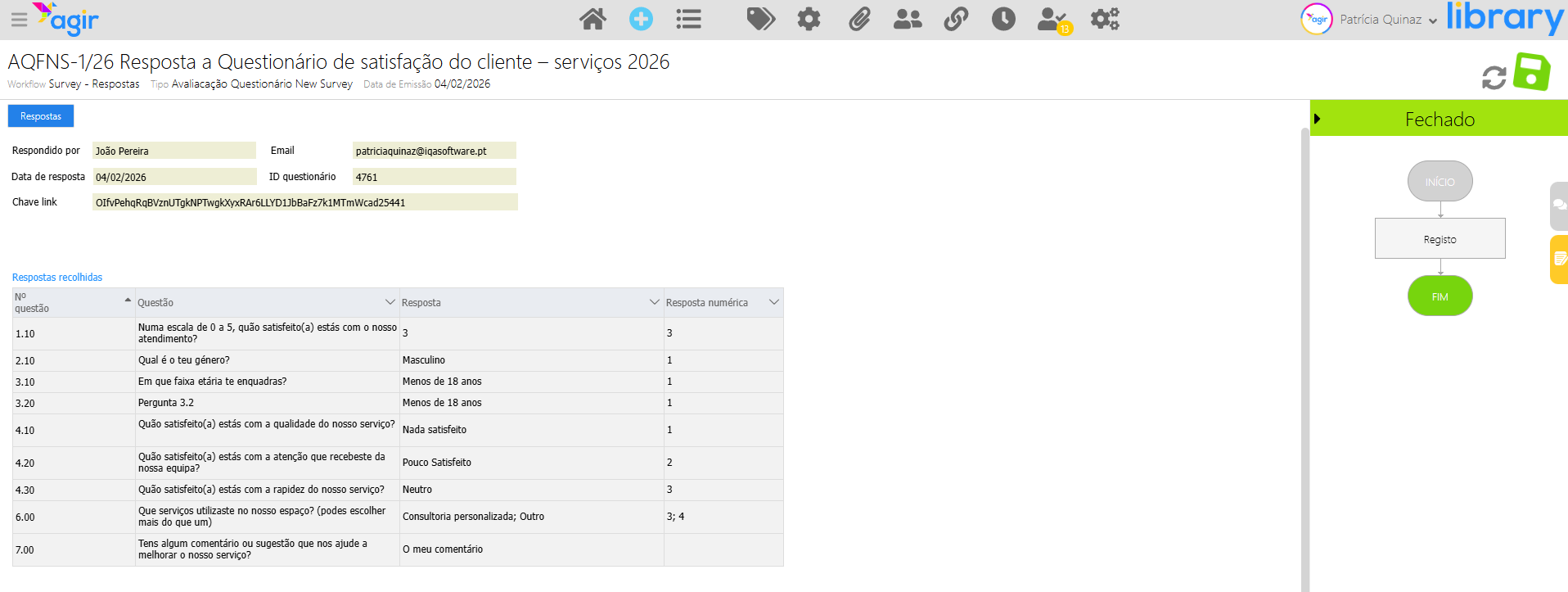 Após a submissão do questionário por parte dos destinatários, todas as respostas são automaticamente registadas no Workflow Survey - Respostas.