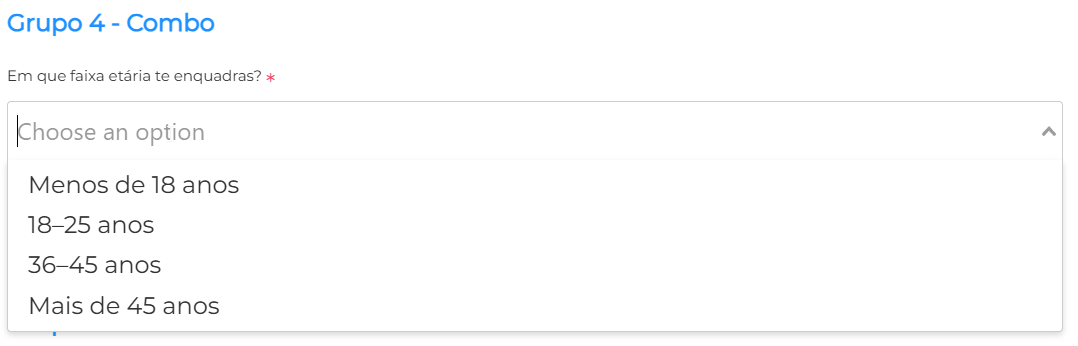 Disponibiliza uma lista de opções num menu suspenso, permitindo a seleção de uma única resposta. É especialmente útil quando existe um número elevado de opções e se pretende manter o questionário mais compacto.