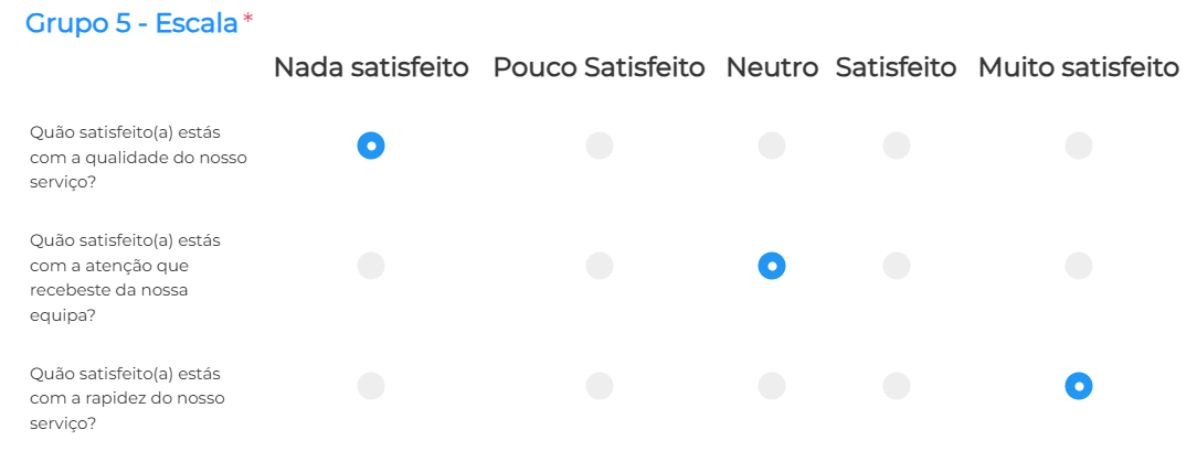 Permite avaliar uma afirmação ou questão com base numa escala definida (por exemplo, de 1 a 5 ou de “Nada satisfeito” a “Muito satisfeito”). É muito utilizada em questionários de satisfação e avaliação.