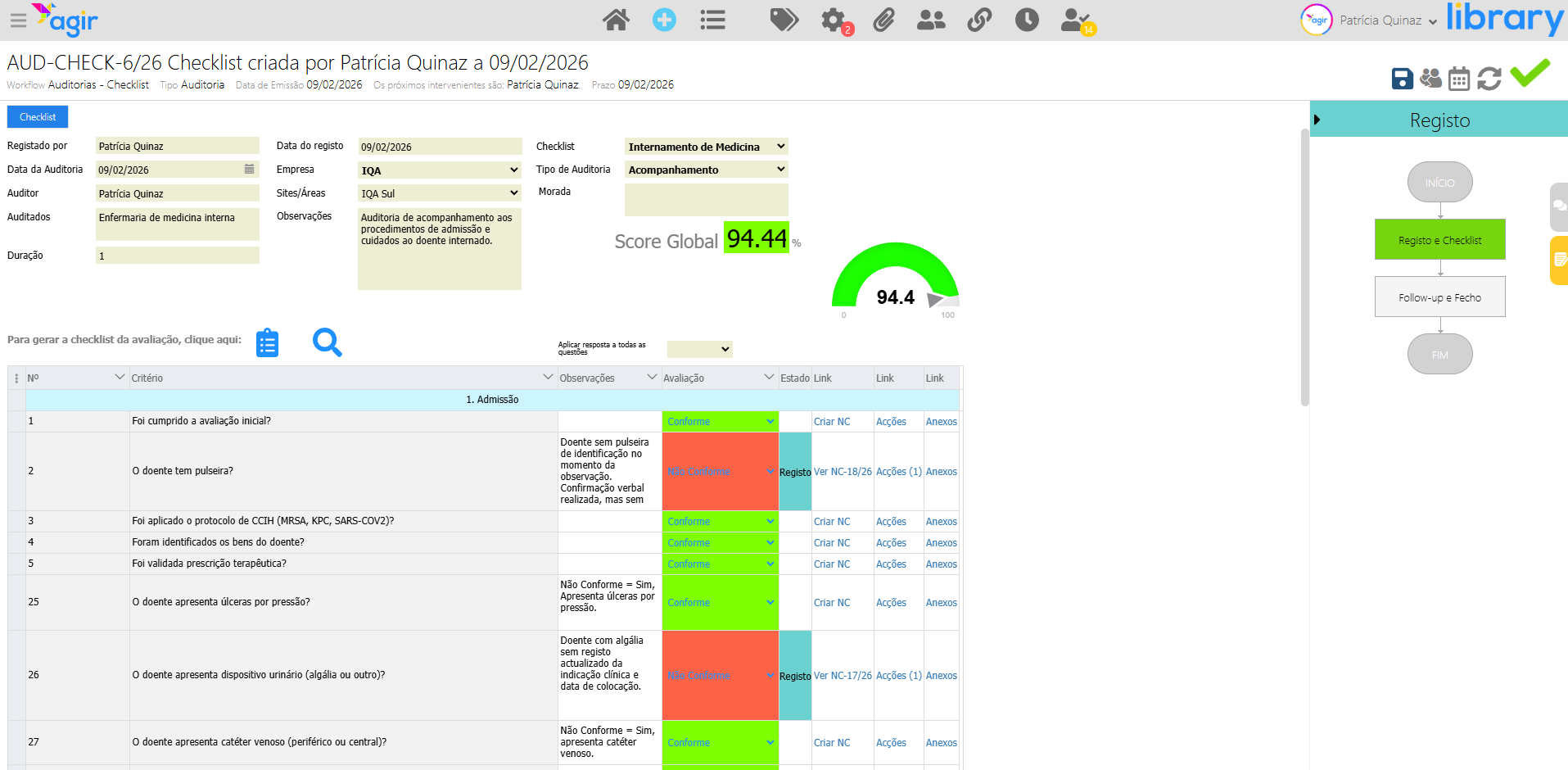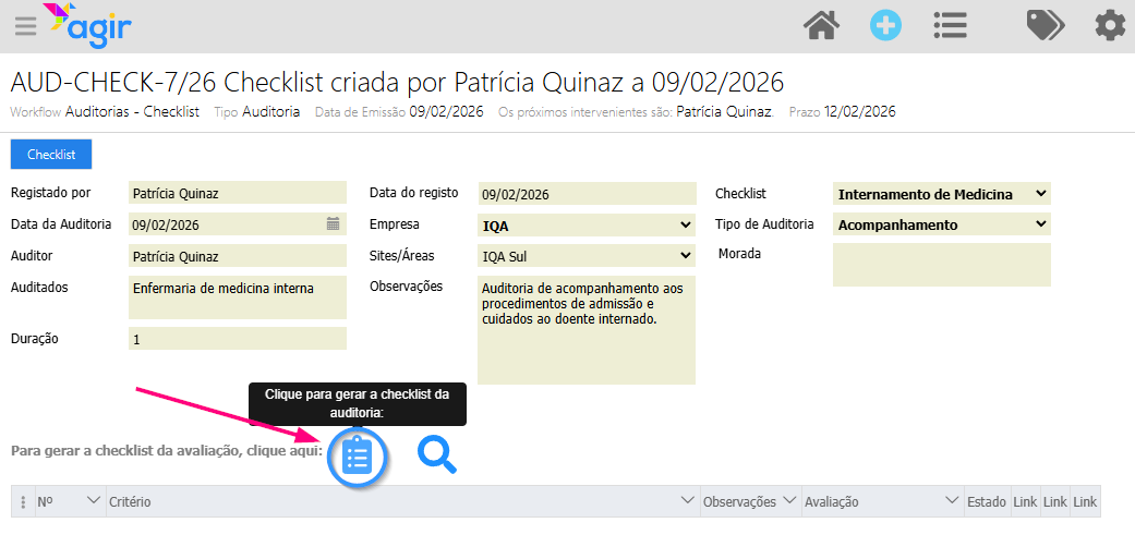 O workflow Auditorias - Checklist no AGIR foi desenvolvido para apoiar a realização, acompanhamento e fecho de auditorias de forma estruturada, consistente e rastreável.