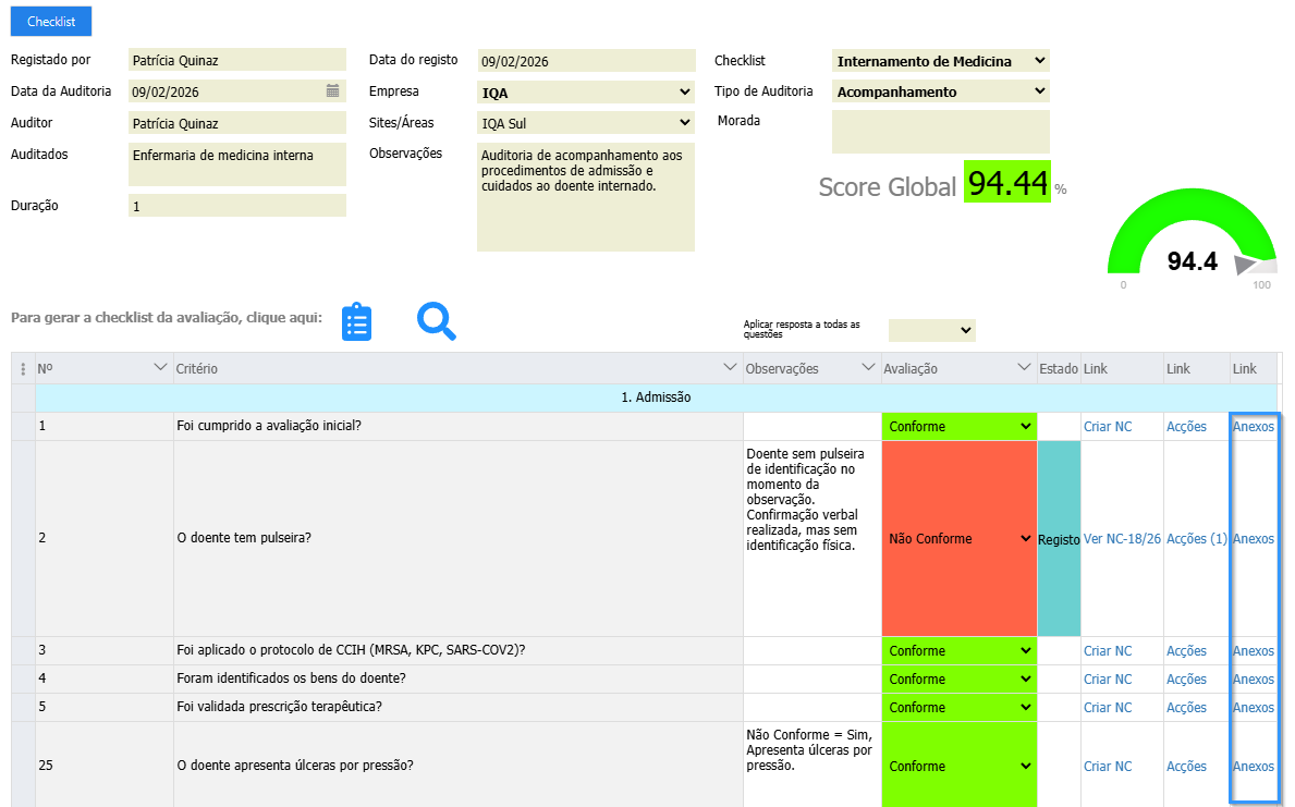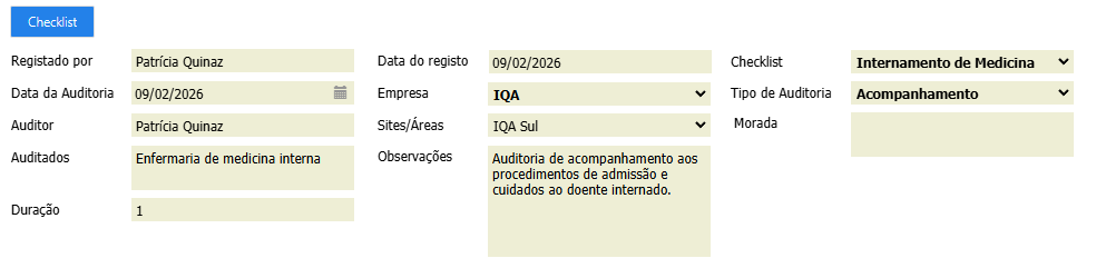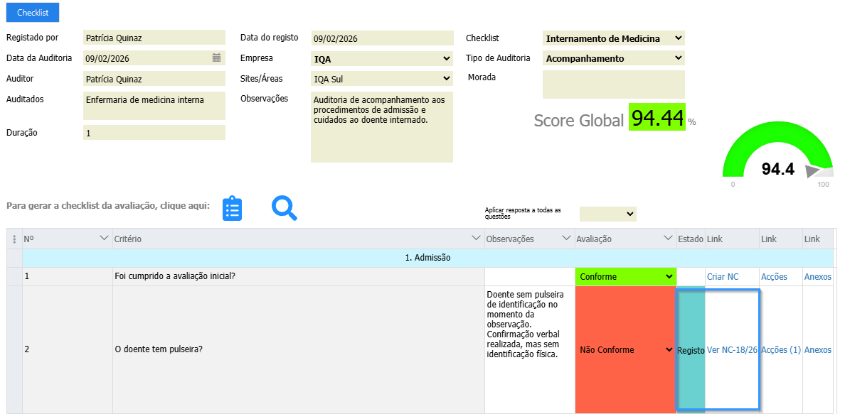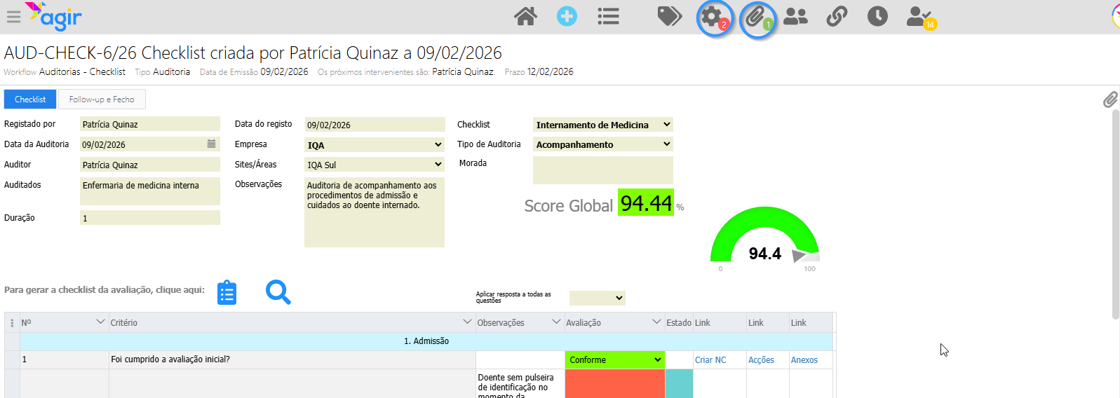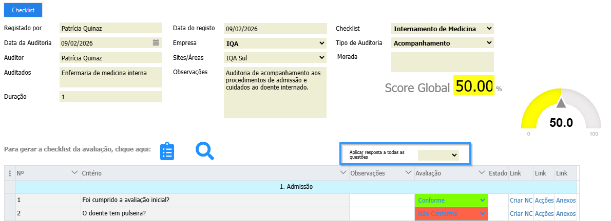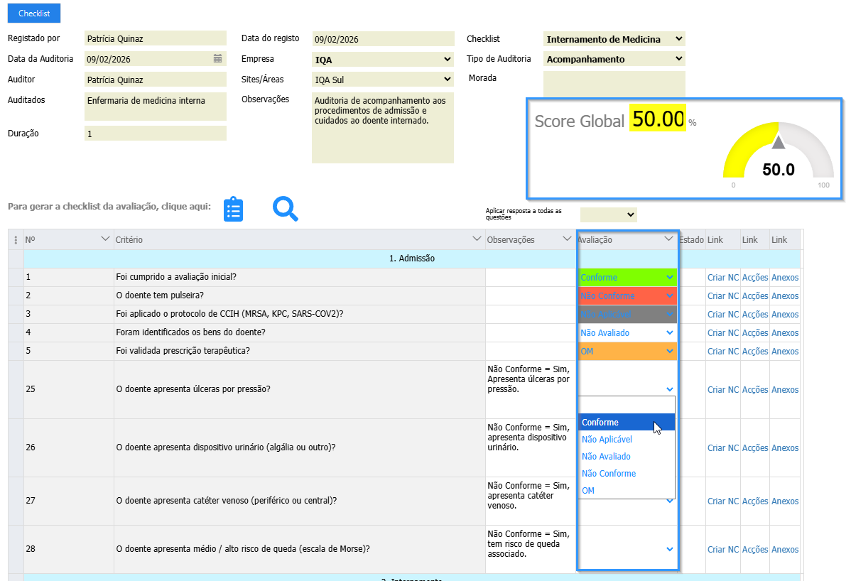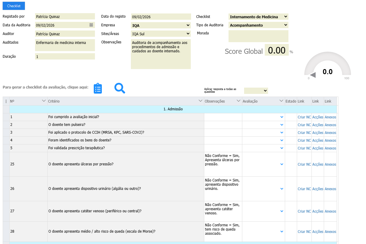 O separador Checklist é onde se realiza a auditoria propriamente dita, desde o registo inicial até à avaliação dos critérios, criação de Não Conformidades, Ações e Anexos de evidências.