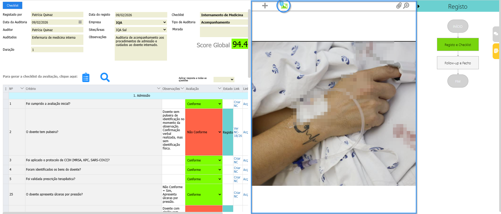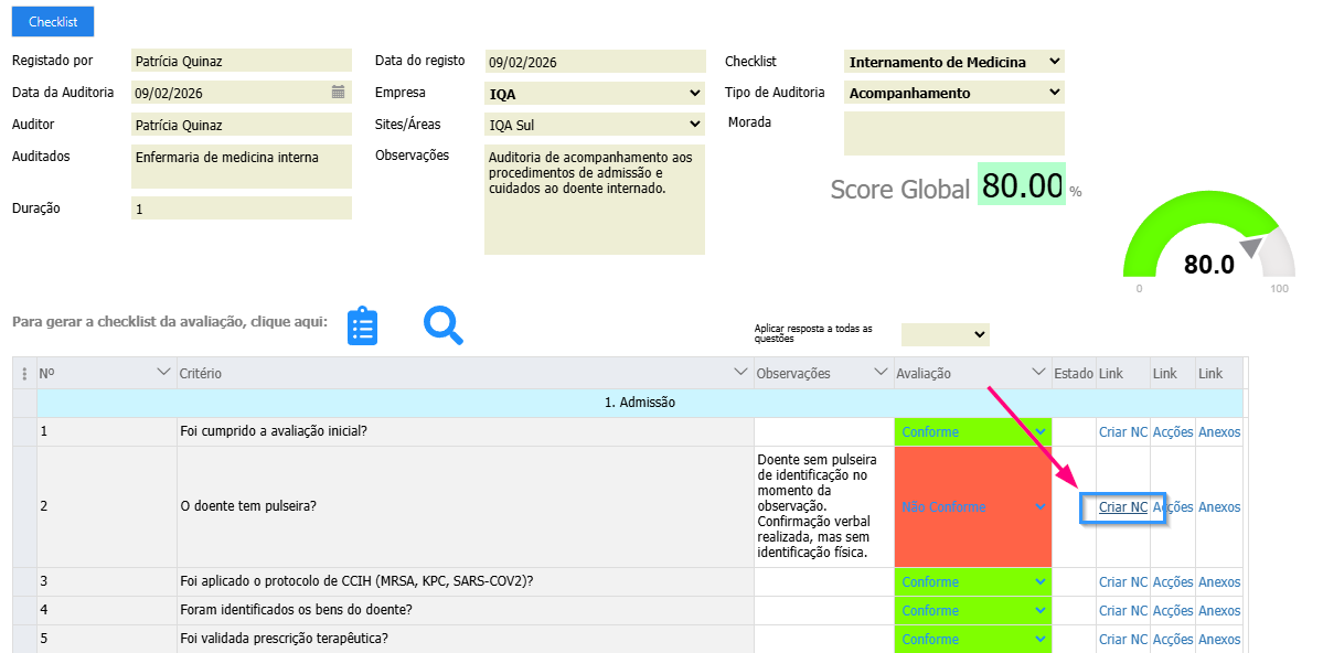 O workflow Auditorias - Checklist integra-se directamente com o workflow de Não Conformidades, permitindo a criação automática de registos sempre que um critério é avaliado como Não Conforme.