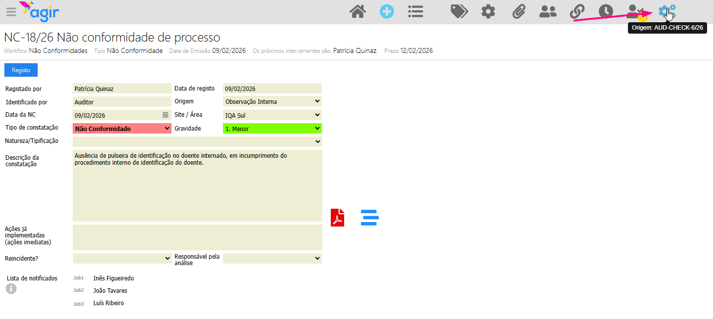 Esta integração garante que todas as Não Conformidades identificadas durante a auditoria são tratadas e acompanhadas de forma estruturada.