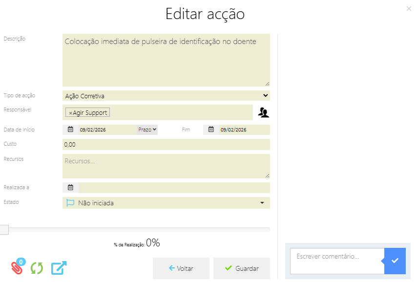 Descreva a ação, selecione o tipo, os responsáveis e o intervalo de datas/prazo. Pode ainda adicionar outras informações como o custo, recursos e notas aos responsáveis.