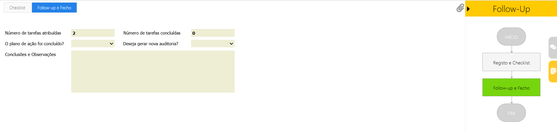 O separador Follow-up e fecho permite acompanhar a execução das ações resultantes da auditoria e proceder ao seu encerramento.