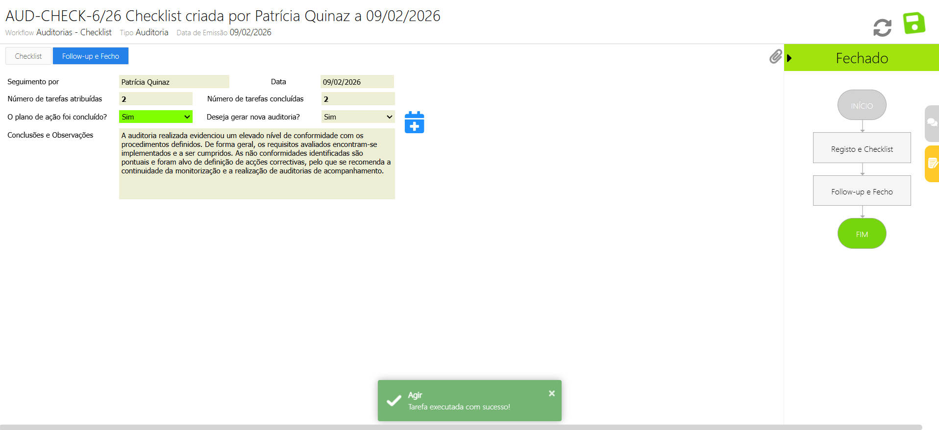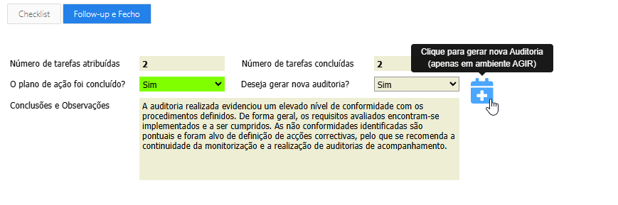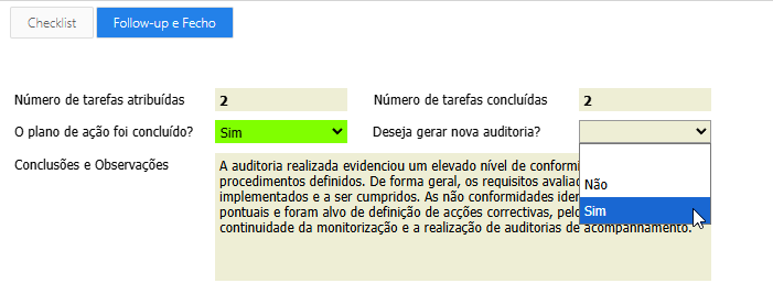 Após o fecho de todas as ações, deve afirmar que o plano de ação foi concluído e confirmar se deseja gerar uma nova auditoria.