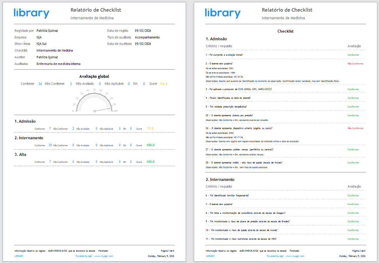 À medida que os critérios são avaliados, o AGIR calcula automaticamente o score global da auditoria, apresentando-o de forma visual e imediata (Score = C / (C+NC).